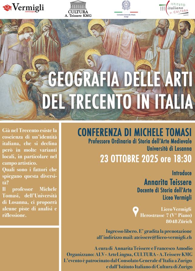 Già nel Trecento esiste la coscienza di un’identità italiana, che si declina però in molte varianti locali, in particolare nel campo artistico. Quali sono i fattori che spiegano questa diversità? Il professor Michele Tomasi, dell’Università di Losanna, ci proporrà alcune piste di analisi e riflessione.